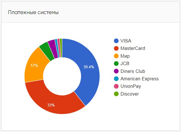 Диаграмма в блоке показывает долю платежей по картам каждой МПС в общем объеме платежей по банковским картам, поступившим на счет мерчанта.