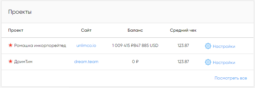 При клике на ссылку в столбце «сайт» сайт интернет-магазина открывается в отдельной вкладке. При нажатии на кнопку «Настройки» происходит переход к настройкам соответствующего проекта в разделе Проекты. При клике на кнопку «Посмотреть все» происходит переход к списку всех проектов мерчанта в разделе Проекты.