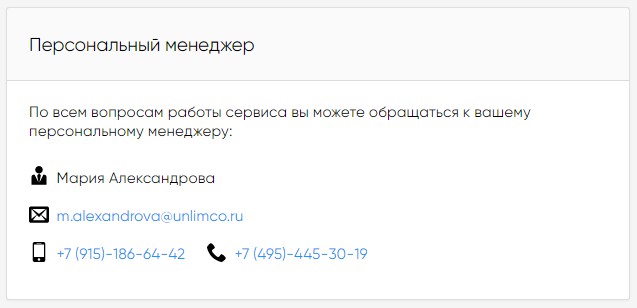 Блок содержит контактные данные менеджера по сопровождению клиентов, персонально закрепленного за мерчантом.