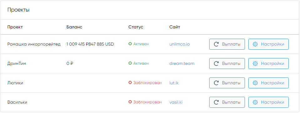 Блок содержит список всех активных проектов мерчанта с краткой информацией о них.