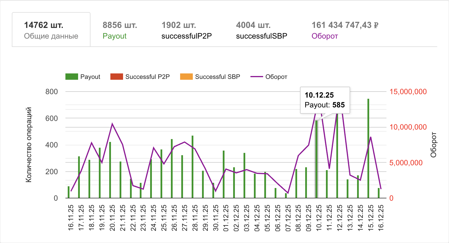 По умолчанию график демонстрируется в режиме вывода общих данных и имеет вид гистограммы, где линейный график показывает изменение величины оборота, а столбцы диаграммы — количество операций в каждом из возможных статусов за конкретную дату.
