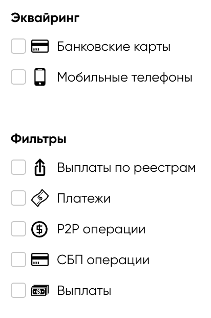 Эквайринг Для выбора операций по признаку способа оплаты отметьте нужный чек-бокс. Если не отмечен ни один из чек-боксов, в результаты включаются операции обоих типов. Фильтры Для выбора сегмента по признаку способа отметьте нужный чек-бокс. Если не отмечен ни один из чек-боксов, в результаты включаются операции обоих типов. |
