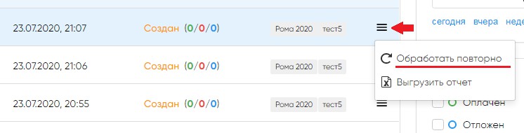 Для повторной обработки отчета с целью проведения ранее не прошедших платежей нажмите на иконку в правой части строки реестра и выберите «Обработать повторно».