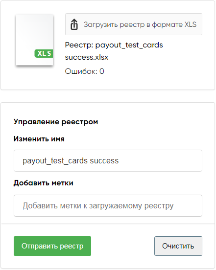 При успешной загрузке реестра в окне загрузки появится имя файла загруженного реестра и сообщение «Ошибок: 0». Ниже отобразится блок «Управление реестрами» с полями для изменения имени реестра (если это необходимо) и добавления меток.