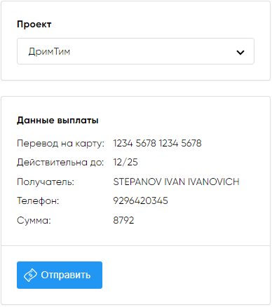 Заполните поля формы «Данные получателя выплаты». Введенные на форме данные появятся в блоке «Данные выплаты» в правой части экрана.