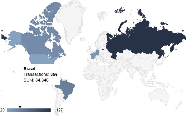 При наведении курсора на территорию страны демонстрируется окно-подсказка с названием страны, общим числом и суммой успешных транзакций.