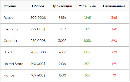 В правой части блока статистики расположена таблица, отображающая детализированные числовые показатели в разрезе каждой страны, а именно: общее количество транзакций, число успешных и отклоненных операций по всем проектам. Страны с нулевыми показателями в таблице не отображаются.